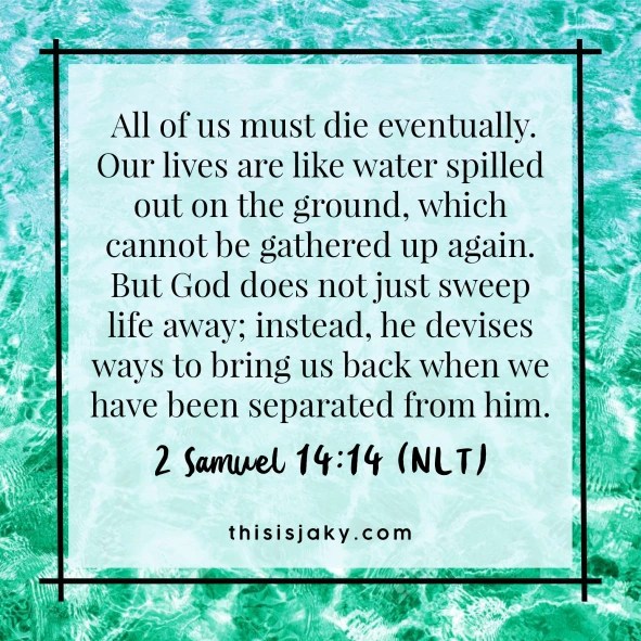 All of us must die eventually. Our lives are like water spilled out on the ground, which cannot be gathered up again. But God does not just sweep life away; instead, he devises ways to bring us back when we have been separated from him.