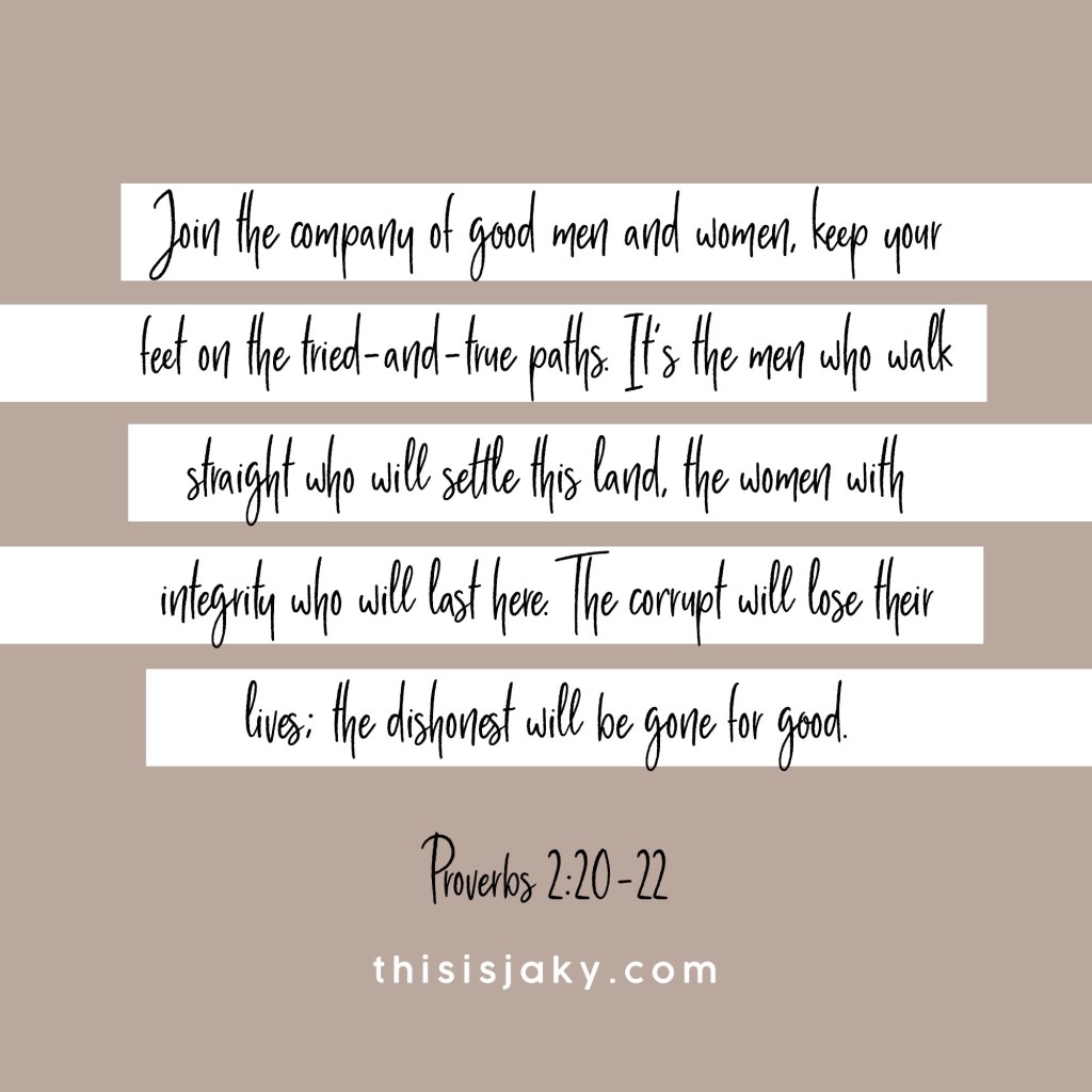 Join the company of good men and women, keep your feet on the tried-and-true paths. It’s the men who walk straight who will settle this land, the women with integrity who will last here. The corrupt will lose their lives; the dishonest will be gone for good. Proverbs 2:20-22
