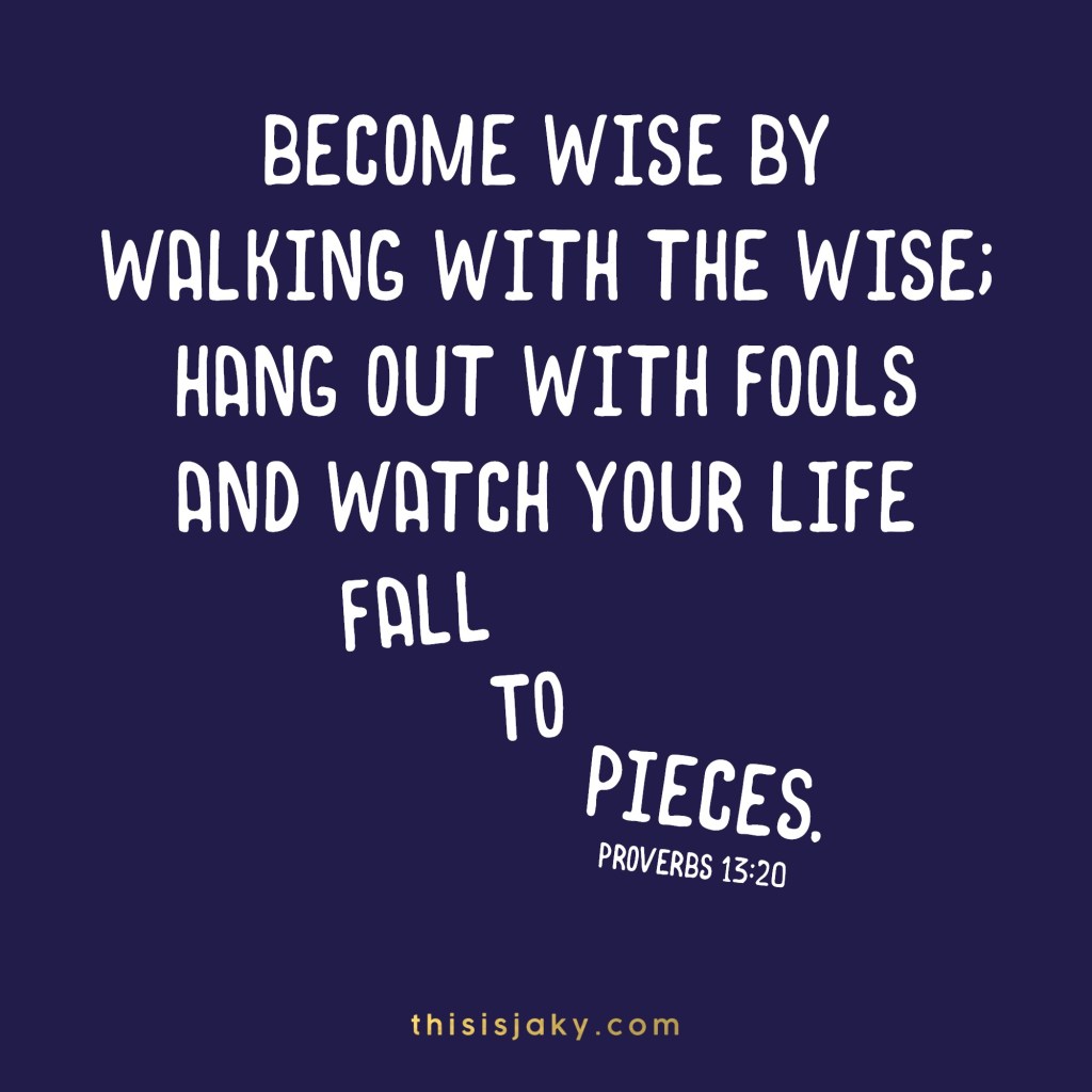 Become wise by walking with the wise; Hang out with fools and watch your life fall to pieces. Proverbs 13:20